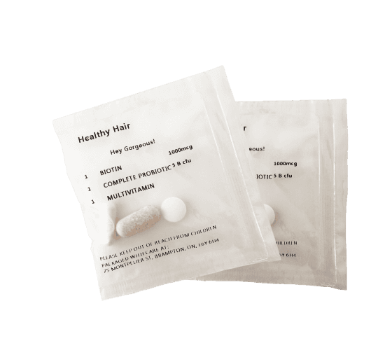 Our specially designed 3 pill vitamin packs helps proactively keep your hair healthy. With a combination of specially picked multivitamin, probiotic and biotin, your hair will feel healthier and fuller than ever before.
