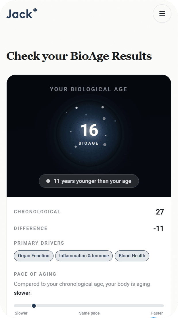 Our most advanced health insight yet! BioAge analyzes over 35 biomarkers to assess how your body is actually aging at a cellular level. These markers include metabolic, hormonal, and inflammatory indicators that influence long-term health outcomes. The result is a personalized view of your internal health, not just your chronological age.