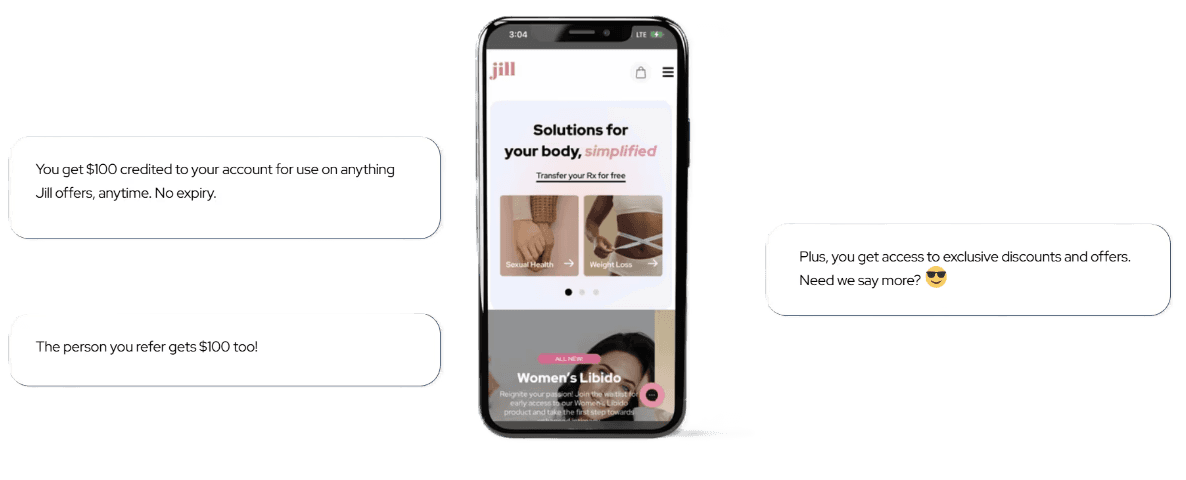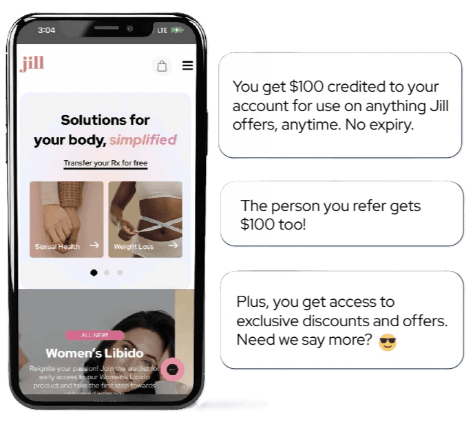 Log in to your Jill account to get your unique referral link and refer a friend—they’ll get $50 off, and you’ll receive a $50 credit, plus access to exclusive offers and deals! Birth control, acne – we offer treatments for issues that affect millions of women worldwide. So share the love, and the rewards 🤝
